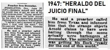 Muy pronto muchos vieron la llegada de los platillos voladores en 1947 como el cumplimiento de la profecía bíblica de los últimos tiempos. “Habrá vistas temibles y grandes señales del cielo … en el sol, en la luna y en las estrellas ” – Lucas 21, Versión King James. La misma idea fue reflejada en la canción “Cuando ves esos platillos voladores” interpretada por The Buchanan Brothers, el 27 de octubre de 1947: