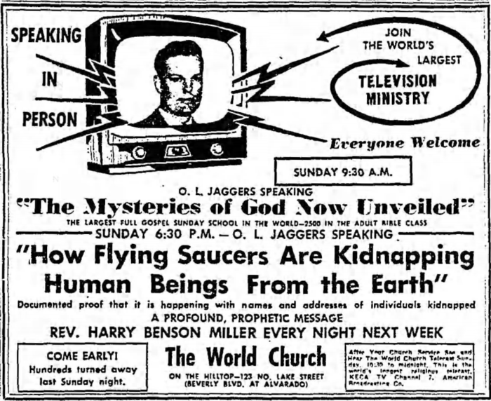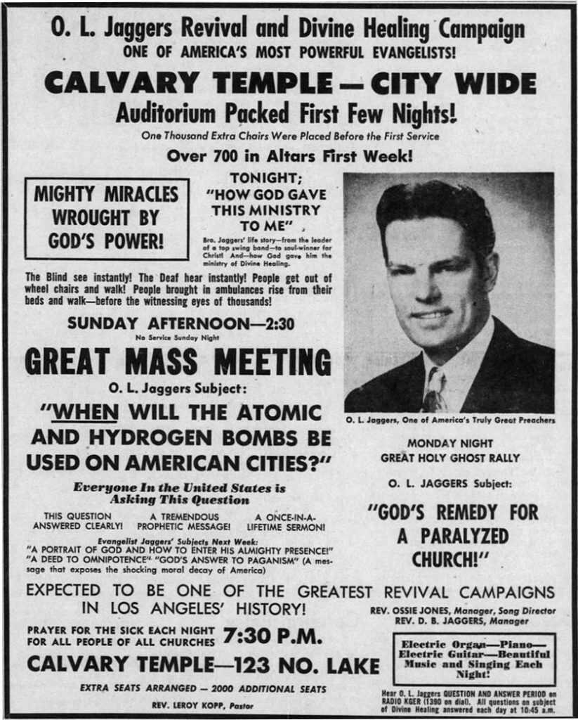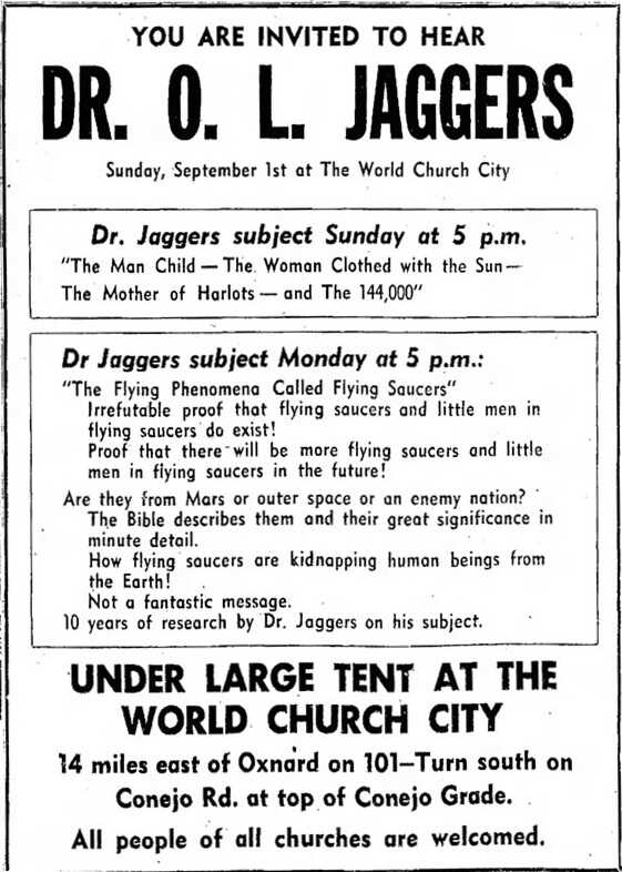 Orval Lee Jaggers (1916-2004), un predicador contemporáneo de Billy Graham (1918-2018) y Oral Roberts (1918-2009), comenzó su ministerio como un exitoso evangelista itinerante de avivamiento, que montaba sus presentaciones en carpas y afirmaba curar enfermos. En 1952 abrió su Iglesia Mundial en Los Ángeles, que en 1956 tuvo más de 10 mil miembros y alcanzó a una audiencia aún más amplia a través de la radio, la televisión y giras ocasionales. Jaggers también escribió más de 300 libros y folletos sobre una serie de inquietudes modernas, desde la amenaza del comunismo hasta la bomba atómica, la inmortalidad y los platillos voladores.