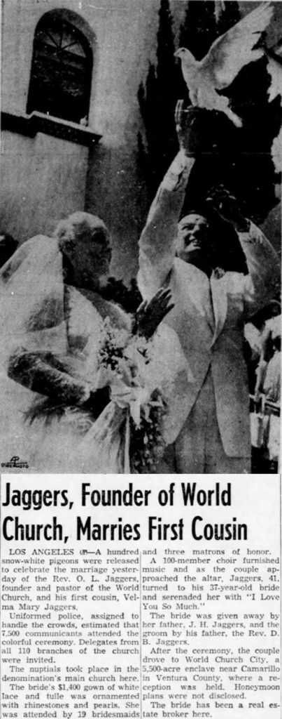 En una ceremonia épica que tuvo lugar en 1957, Jaggers se casó con su prima, «la señorita Velma», y las presentaciones de la iglesia se volvieron más teatrales. A ella se la solía mostrar «volando por encima de la congregación» a caballo, en un carro, una nave espacial o vestida como un ángel. Las enseñanzas del Reverendo Jaggers fueron polémicas y él tuvo una relación adversa con la iglesia pentecostal. “Su imaginación se volvió loca”, se dijo. Sus afirmaciones según las cuales el aceite de curación milagrosa fluía de sus manos, o que sus creyentes podían alcanzar la inmortalidad física, eran difíciles de aceptar incluso por sus hermanos en la fe.