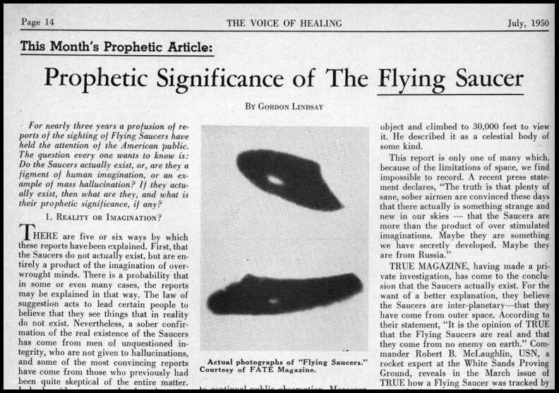 “Significado profético del platillo volador” por Gordon Lindsay, en La Voz de la Curación , julio de 1950