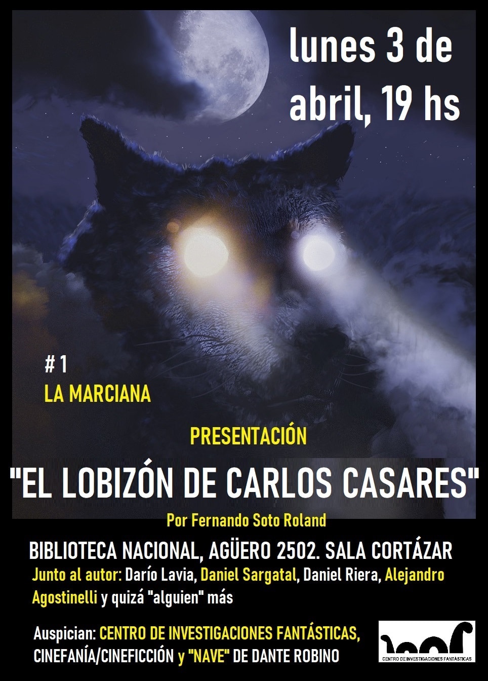 El lunes 3 de abril, en la Sala Cortázar de la Biblioteca Nacional, acompañarán a Fernando Soto Roland en la presentación de su libro «El Lobizón de Carlos Casares» los miembros del Centro de Investigaciones Fantásticas Editores (CIFE) Darío Lavia (escritor y editor de Cinefanía/Cineficción), Daniel Sargatal (escritor, poeta y canalizador del distinguido predicador Fray Servando) y Daniel Riera (escritor, editor y ventrílocuo) y Alejandro Agostinelli (periodista, editor de Factor y director de la colección La Marciana).
