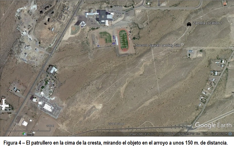 Creo que lo que el oficial Zamora vio fue un automóvil que estaba particularmente brillante debido al bajo ángulo del sol. La vista de las «piernas» podría haber sido fácilmente los neumáticos de un vehículo, especialmente porque dice que las vio desde la vista del extremo, pero no desde la vista lateral. Creo que los detalles que da más tarde sobre la forma del objeto y la vestimenta de las personas fueron influenciados por su experiencia unos segundos después en el segundo avistamiento del objeto. La vista desde 150 metros es demasiado lejana como para haber podido discernir los detalles que dio, especialmente dado que el tiempo de observación fue de menos de dos segundos, según su informe. La Figura 4 muestra las ubicaciones relativas del automóvil del oficial Zamora y el objeto en el terreno actual.