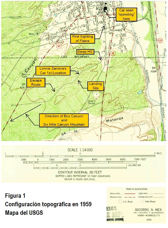La Figura 1 muestra una porción de este mapa con las ubicaciones importantes identificadas. Se puede observar que varias estructuras que ahora existen a lo largo de la Carretera 60, incluyendo la nueva Escuela Secundaria de Socorro y el Hospital General, no existían en el momento del avistamiento. Además, la Carretera Interestatal 25 terminaba al norte de Socorro y la carretera principal al sur de la ciudad era la Carretera 85. El acceso a la Carretera 85 desde Park St/Old Rodeo St que estaba disponible en 1964 fue eliminado cuando la Interestatal 25 se extendió al sur de la ciudad a fines de la década de 1960. Varias carreteras que ahora existen en el área no existían en 1964, como se puede ver en el mapa, y algunas secciones de carreteras, como la empinada porción de lo que ahora es Raychester Rd., han sido reubicadas y reprocesadas.