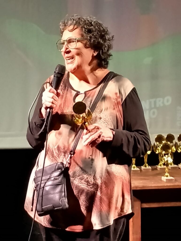 Las sorpresas de la noche vinieron de dos figuras que, literalmente, se habían borrado del mapa. Sí, desaparecidos del radar desde hacía décadas. La primera fue Vivian May Brown, que en 1978 publicó un libro de cuentos breves que la rompió: 20 Cuentos Azules (Plus Ultra). Fue tan bueno ese libro que ganó premios en el exterior. En su momento, parecía que iba a ser la gran voz de la CF de los ’70, pero entre líos editoriales y otros vaivenes, se esfumó sin dejar rastro. Nadie sabía nada de ella. Pero el equipo organizador se lanzó a una búsqueda sin respiro y dio con ella. Así, Vivian —feliz y emocionada— recibió su premio no sin ovación, tanto de su familia como de un público fascinado con su historia.