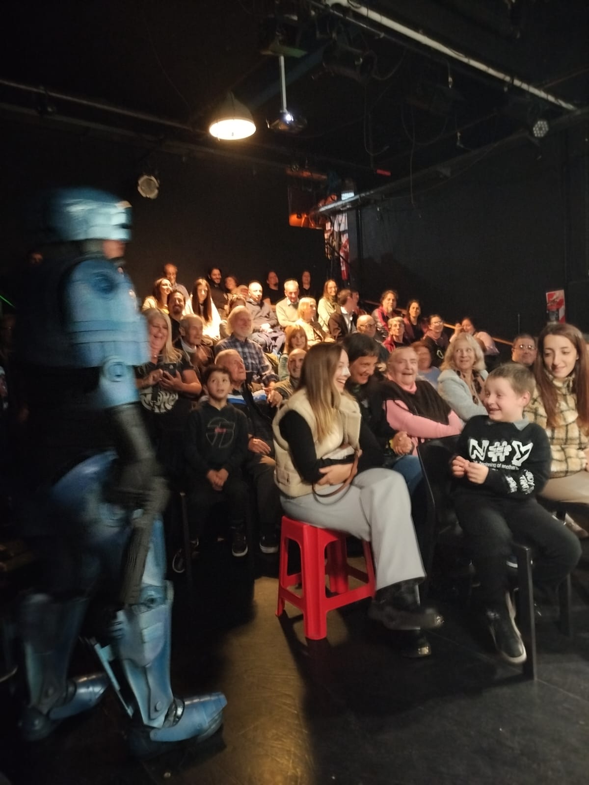 A las 20:10, la sala desbordaba de murmullos y expectativas flotando en el aire. Y a las 20:15 en punto comenzó la presentación del evento. Para sorpresa de todos, cuando el bibliotecario catalán Carles Ros Más, impulsor de la saga en 2024, tomó el micrófono para abrir la noche, desde el fondo del escenario apareció una imponente versión argentina de Robocop. El soterrado carisma del actor Gaby Delmónico marcó el tono inicial: sonrisas, asombro y una cálida disposición a disfrutar lo que venía.