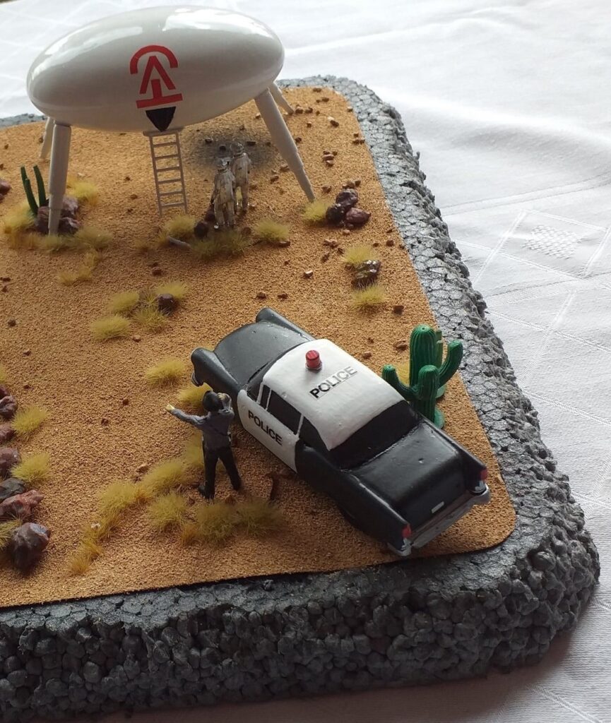MURAL EN SOCORRO. Obra que conmemora al oficial D. Lonnie Zamora de la artista Erika Burleigh. Calle Park, a una milla al sur de la Plaza en Socorro, Nuevo México. Acrílico sobre estuco, 15 x 42 pies (2012).