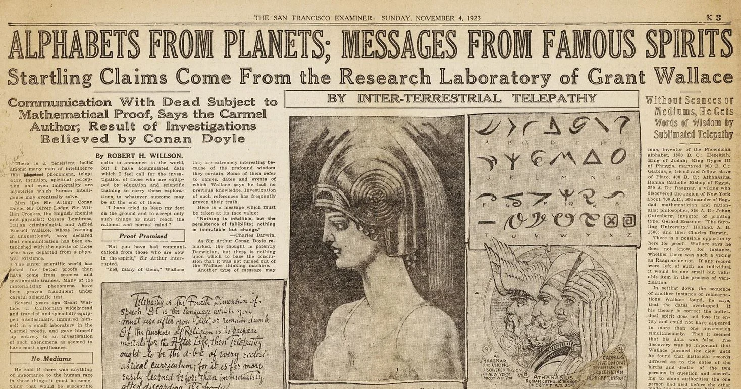 Pero Wallace fue más allá de la Teosofía. Sante señala que la «lista temprana de contactos astrales de Wallace incluye a egipcios, antiguos griegos, vikingos, atlantes; Hipócrates, Thomas Jefferson, Thomas Paine, Charles Dickens, Charles Darwin y la socióloga Harriet Martineau… Sin embargo, al poco tiempo, comenzó a recibir comunicaciones de lugares más lejanos, empezando por los demás planetas del sistema solar. Compiló alfabetos en Mercurio, Venus (dos niveles sociales), Marte, Júpiter, Saturno, Neptuno y Titánico, pertenecientes a la luna más grande de Urano. Y luego comenzó a recibir noticias de entidades en el ‘noveno planeta’, Azoth, y finalmente de seres en planetas de la estrella Altair, el cúmulo estelar de las Pléyades y la galaxia de Andrómeda».