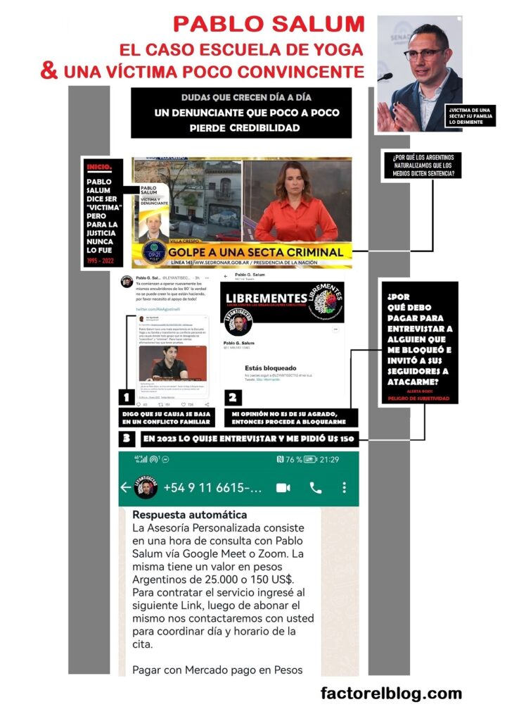 Así, somos parte de su confabulación imaginaria la periodista Victoria de Masi (por entrevistar a su hermano German), Reynaldo Sietecase (atacado en sus redes sociales, e insultado por el propio Salum en su canal, por compartir la nota publicada en Factor sobre la querella que le inició a Salum su madre) y, por supuesto, a mí mismo, que desde el primer día cuestiono y hago preguntas sobre sus afirmaciones, tomadas seriamente por la PROTEX y el juez Ariel Lijo, apropiándose incluso de sus prejuicios y sesgos, afectados más por un drama familiar que por el accionar de una “organización coercitiva” o “secta”. El fundamento para dar trato de víctima a personas que niegan serlo es una teoría desacreditada hace décadas, llamándose según la época y el contexto «lavado de cerebros», «reforma de pensamiento», «despersonalización» y, más recientemente, «persuasión coercitiva».