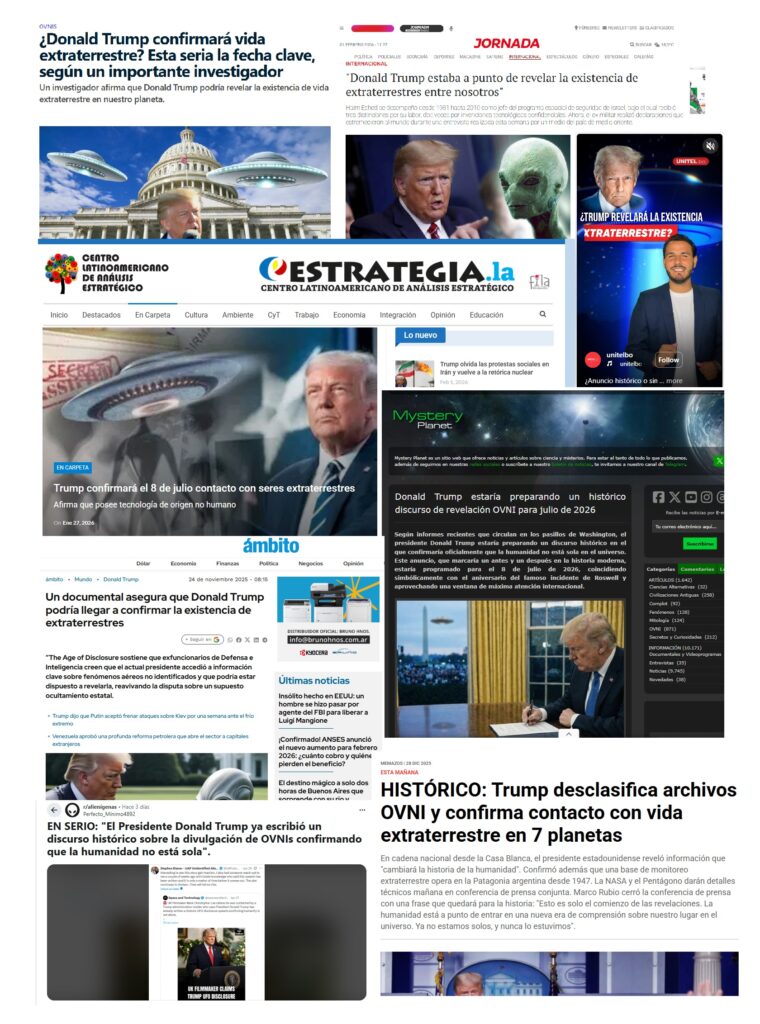 ¿Es cierto que a Trump le conviene hablar de extraterrestres en medio de la escalada militarista global y la cacería de inmigrantes? ¿Es funcional alimentar versiones disparatadas en el Salón Oval sobre la inminente revelación alienígena para desviar la atención de frentes críticos? En este escenario, la ufología parece aligerar una cargada agenda interna, que va desde la violencia del ICE hasta los vínculos de Trump con Jeffrey Epstein, y otra externa que incluye el secuestro de Nicolás Maduro y su esposa, las amenazas de invasión a Groenlandia e Irán y el apoyo al Terrorismo de Estado de Israel en Gaza. ¿Pueden versiones sobre unas granjas de Grises frizados en el Area 51 o sobre presuntos pactos secretos con especies reticulanas tapar las movilizaciones por los asesinatos cometidos por el ICE, marear la perdiz tras la guerra comercial provocada por los chantajes arancelarios o alejar la mirada de la escalada armamentística?