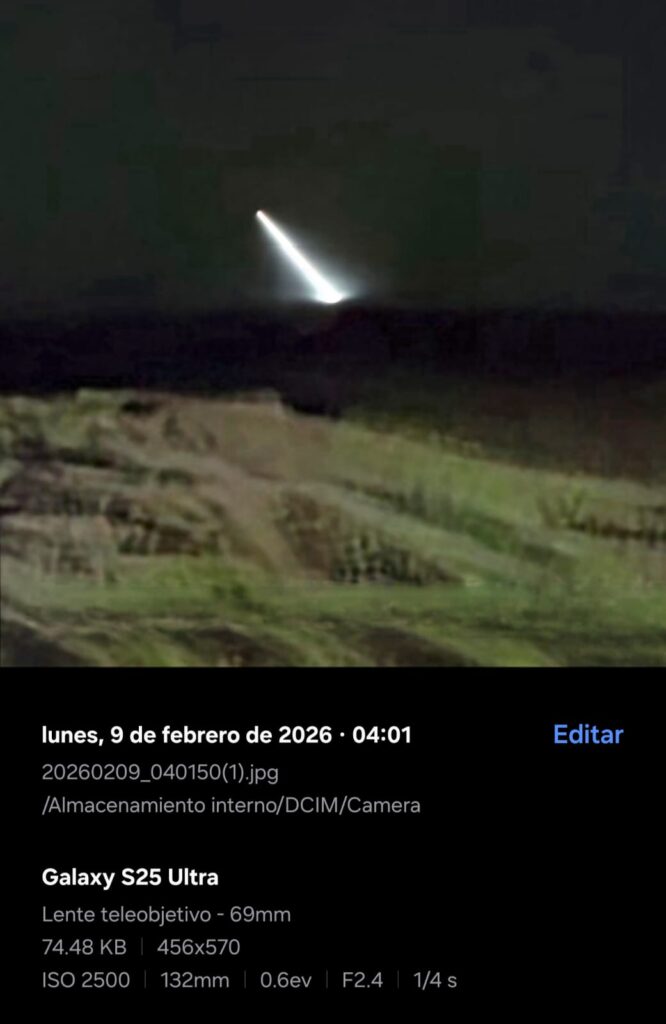 18/2. Al anochecer del día en que publicamos este post hemos recibido link a un artículo en el que la fotografía parece haber sido tomada en una fecha diferente a la consignada en este post. También, ofrece información adicional sobre la fotógrafa, Eve Diaz Fritz. Para tomar la imagen, ella usó un smart phone Samsung Galaxy s25 Ultra y se ubicaba en Clemente Onelli, Provincia de Río Negro. Según los metadatos, la foto se tomó a las 4:01 AM (hora aproximada del evento que da cuenta este post) pero.. del lunes 9 de febrero. De ser esta fecha correcta, nuestra hipótesis NO explicaría el origen del estímulo lumínico fotografiado. Ahora bien, la noticia publicada en el diario NQN asegura que ocurrió el 12, y en el artículo que incluye la imagen de los metadatos, en la entrevista a Diaz y otros acompañantes, nadie confirma fecha ni hora del evento.